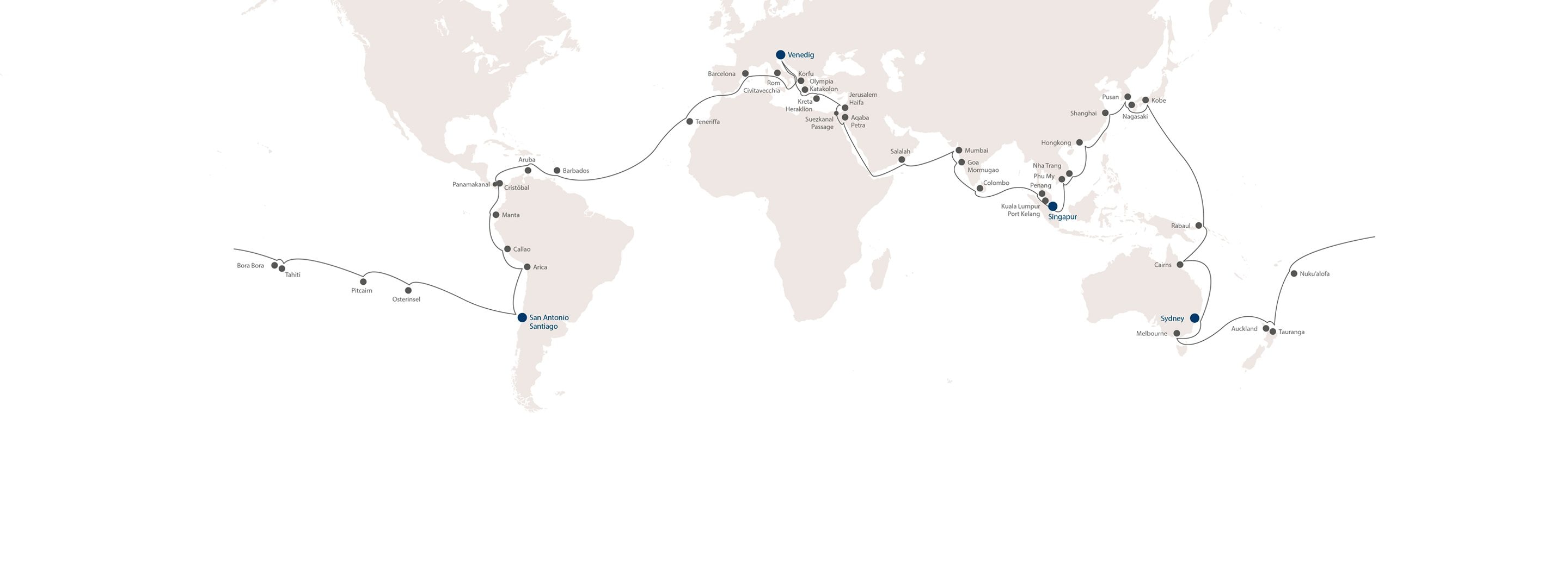 Route: Venedig – Bari – Civitavecchia – Marseille – Barcelona – Casablanca – St. Cruz de Tenerife – Port Castries – St George – Oranjestad – Cartagena – Puerto San Jóse – Puerto Vallarta – San Diego – San Francisco – San Francisco – Honolulu – Pago Pago – Nuku’Alofa – Sydney – Singapur – Port Klang – Langkawi – Phuket – Colombo – Kochi – Mormugao – Mumbai – Dubai – Muscat – Salalah – Aqaba – Katakolon – Venedig.