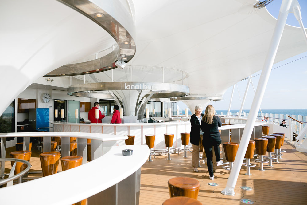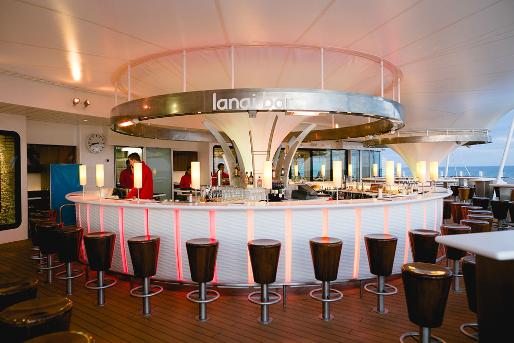 Die geräumige Lanai Bar mit Innen- und Außenbereich findet sich auf den Schiffen der Hyperion- und Helios-Klasse. In der Bar genießt man einen herrlichen Blick auf den Sonnenuntergang.