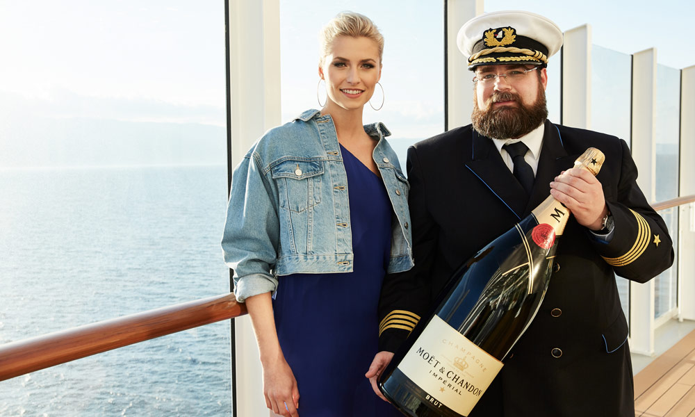 Die Taufflasche, 12 Liter Moët & Chandon Champagner, befindet sich bereits an Bord, gut verwahrt in der Obhut von Kapitän Becker. Gegen 22.15 Uhr ist es dann endlich soweit: Lena Gercke tauft mit Taufkapitän Boris Becker an ihrer Seite das zwölfte Mitglied der AIDA Flotte.