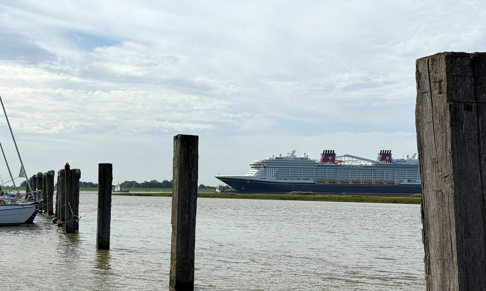 20.09.2025, 13:15 Uhr: Das Emssperrwerk in Gandersum mit einer Öffnungsbreite von 60 Metern ist passiert und die nun bereits gedrehte Disney Destiny fährt an Emden, der größten Stadt Ostfrieslands, vorbei. Letztes Ziel auf der Etappe der Ems-Überführung ist das niederländische Eemshaven, das gegen Abend erreicht werden soll.