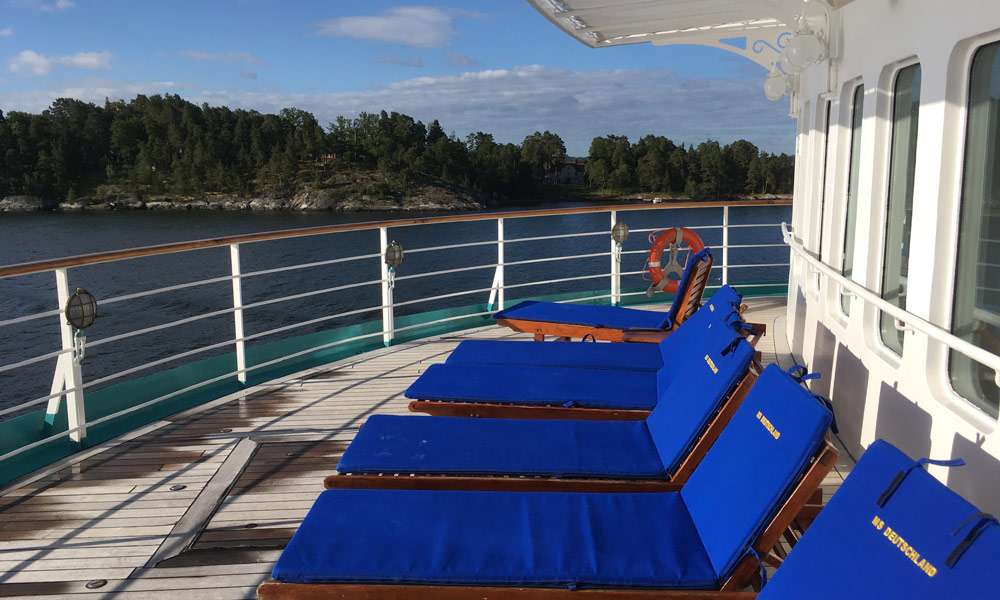 Für die MS Deutschland ist es unter der türkisfarbenen Flagge von Phoenix Reisen die siebte Reise im Jahr 2017. Sie ist ausgebucht, verrät der Kapitän, der in seinen Ansprachen stets zum Ausguck halten rät: Es gibt immer etwas zu sehen. Vor der Einfahrt nach Stockholm beispielsweise solle man unbedingt auf dem Außendeck sein, egal wie das Wetter wird.