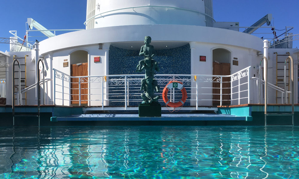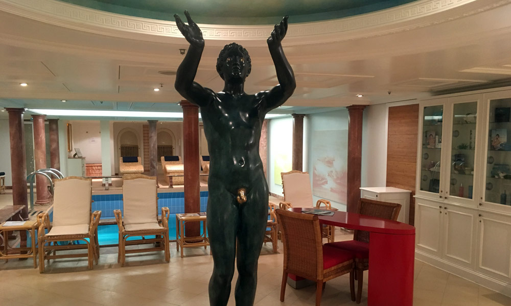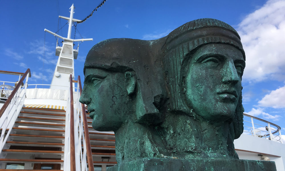 Pünktlich betrete ich als vorletzter Passagier das Schiff. Ein paar hundert Meter weiter liegt die große Phoenix-Schwester MS Artania, die beim Auslaufen unter der Traumschiff-Melodie mit ächzenden Typhon-Tönen beider Schiffe verabschiedet wird. Viele Crewmitglieder und Passagiere stehen auf den Außendecks und Balkons und winken sich herzlich, zum Teil mit weißen Taschentüchern und Phoenix-Winkhänden, zu – viele der Besatzungsmitglieder beider Schiffe kennen sich. A propos Crew: Unser Schiffsarzt hat sich selbst einen Schnupfen eingefangen, hat aber zum Glück zur Zeit nicht allzu viel zu tun.