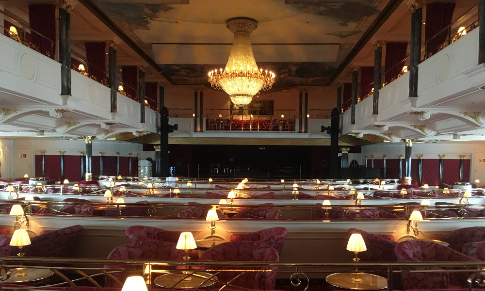 Bei der abendlichen Willkommensgala im Kaisersaal stellen der erfahrene Kapitän Flohr und der deutlich jüngere Kreuzfahrtdirektor Schädel einen Teil und die wohl wichtigsten Offiziere der 280-köpfigen Crew vor und geben einen Ausblick auf die bereits begonnene Ostseereise. Bei dem Gala-Abendessen speisen beide Hauptprotagonisten an ihrem angestammten Sitzplatz in Mitte des Restaurants Berlin – eben genau wie auf dem Traumschiff. Neben mir sitzt Bordpfarrer Heinemann und seine Frau sowie zwei ältere Paare, allesamt aus dem Rheinland, an einem runden Achtertisch. Als Vorspeise gibt es eine Pescaccio Oriental mit Lachs, Wildkraftbrühe mit Calvados und Pistazienklößchen und ein Sorbet aus Schwarzer Johannisbeere, dazu Champagner. Als Hauptgericht wird Atlantik Steinbuttfilet oder Entrecôte Double vom Maredo Rind gereicht, zum Dessert schlemmen wir nur das Beste von der Erdbeere. Alle sind zufrieden und essen ihre kleinen, hübsch dekorierten Portionen sauber auf.