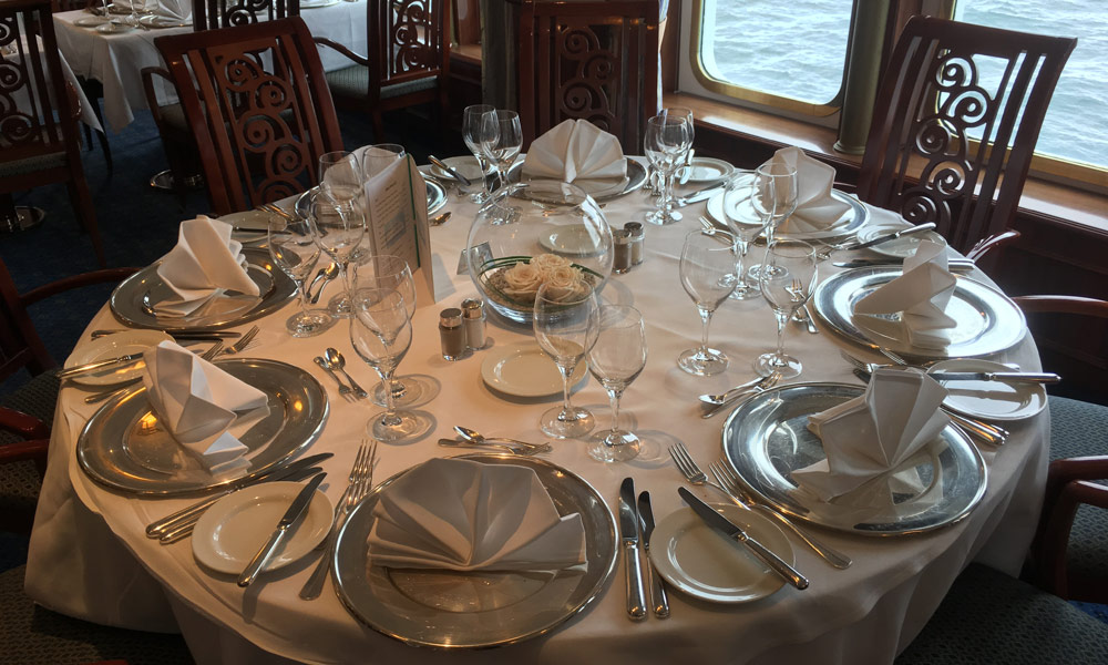 Nachdem die Rettungswesten den meisten Passagieren jetzt noch passen, geht es schon zum ersten Abendessen. Doch wohin? Mein unentschiedener Gang führt mich ins Restaurant Berlin. Dort wird zu zwei Tischzeiten mit Tischplatzreservierung und einem fest zugeordneten Platz gegessen. Da neben dem Kapitän kein Platz mehr ist, entscheide ich mich für den runden Tisch am Fenster. Tisch Nummer Sieben. Ein älteres Paar sitzt schon da, wir unterhalten uns und essen gemeinsam. Ein Herr kommt zwischendurch dazu und meldet sich und seine Frau für den heutigen Abend an unserem Tisch ab. Wir werden uns sicher wiedersehen.